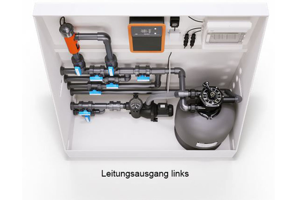 Die Technikwand kann direkt in Ihrem Poolhaus, in Ihrer Garage oder im Keller platziert werden. Die Auswahlmöglichkeit der Leitungsausgänge rechts bzw. links lässt jede Stellmöglichkeit zu. Dies sorgt für minimalen Bauaufwand, geringe Kosten und eine schnelle Inbetriebnahme.